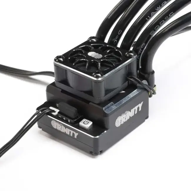 The Trinity MX10 Gen 3 160A Sensored ESC has been designed for the most competitive 1/10 and 1/12 scale stock and mod racers. The MX10 offers a 160-amp constant power rate and an incredible 1200-amp burst rate. All this power comes in a sleek black machined aluminum case designed for maximum heat dissipation. This third generation ESC also features a 32-bit microprocessor for more powerful processing capability and more precise power output. Each ESC comes with our updated high strand count, high flex 13-gauge wire, fan, and capacitor bank. A shortened receiver connector wire comes standard to make sure your wiring looks clean. The MX10 Gen 3 ESC can be programmed by the Trinity LCD ESC Program Box or the Trinity OTA Programming Module (sold separately) to take your driving to the next level.
